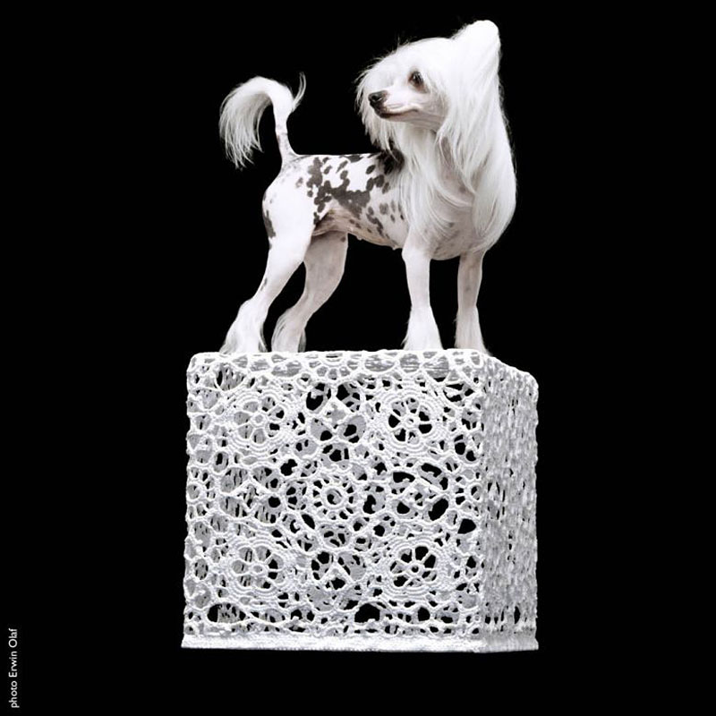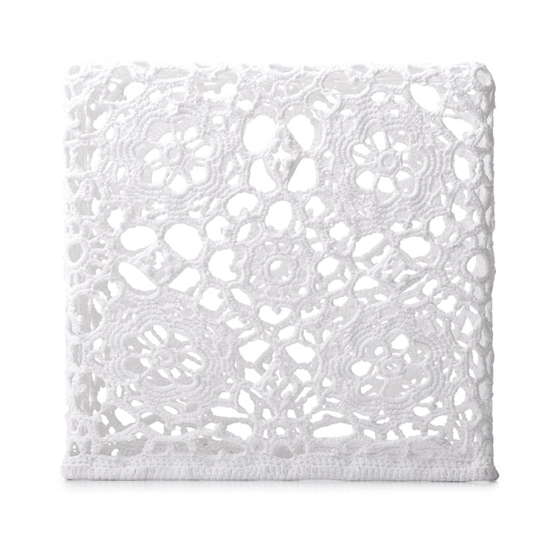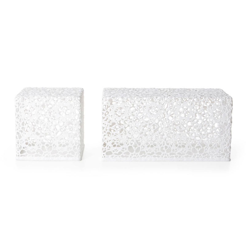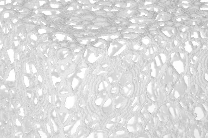 ハンドメイドのコットンクロシェ(かぎ針を使って編む手芸レース)をエポキシ樹脂で固めてつくった作品。デザイナーのマルセル・ワンダースが熟練のクラフトチームと共同開発した、驚くほど軽量(1.1kg)でどんなインテリアにも溶け込む究極のローテーブル。編み目から透ける光は、美しい陰影をフロアに落としてくれます。