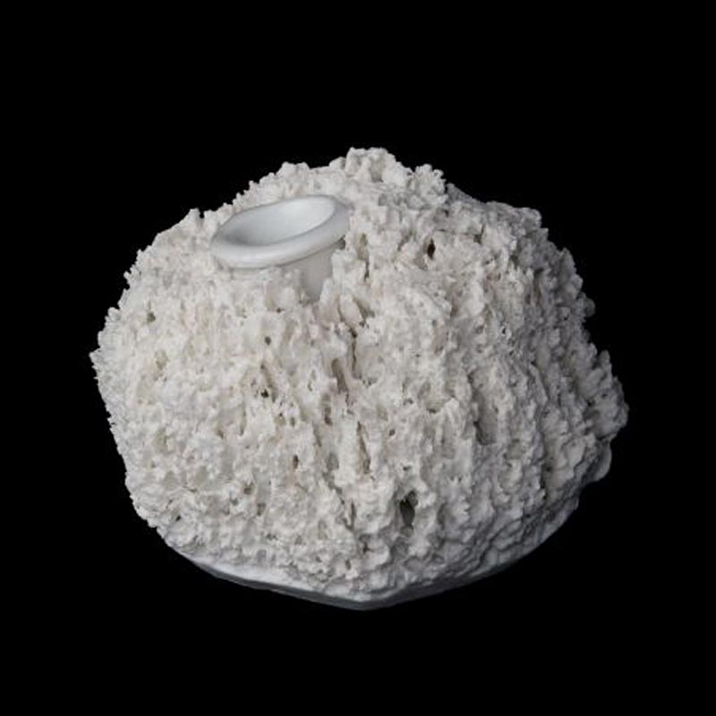 磁器は精巧なつくりや繊細なデザインを表現するのには一番適していますが、型でつくられると途端にその魅力を失います。このボウルは型をつくらず、意表をついたアイデアのもとで製作されています。まず樹脂でできたスポンジを磁器の粘土に浸し、粘土を染み込ませます。そしてそれを焼いて、スポンジは跡形もなく焼失させる、そんな発想が生んだデザインです。