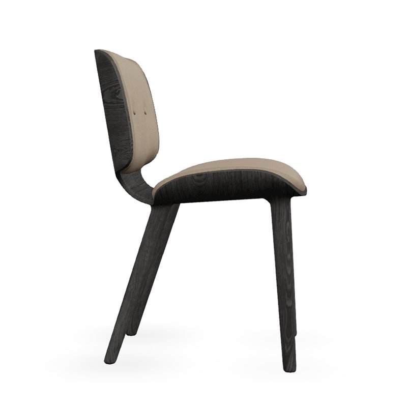 座面と背もたれは同じ形状で、オーク材のプライウッドによるフレーム構造です。シェル状に左右がラウンドし、包み込むようなデザインは二枚貝を連想させます。座ってみれば、たちまち自分がアコヤ貝に守られ育つ、美しい真珠になった気分になれるかも。