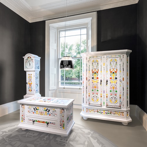 スタジオ・ヨブは、ドイツに古くから伝わる収納のスタイルを活かしつつ、美しすぎる解釈をデザインしました。無垢のパイン材はキャンパスに見立てられ、ハンドペイントによって象徴的なモチーフが色鮮やかで神秘的に生まれ変わり、スムーズかつ密接に連鎖したパターンで描かれています。