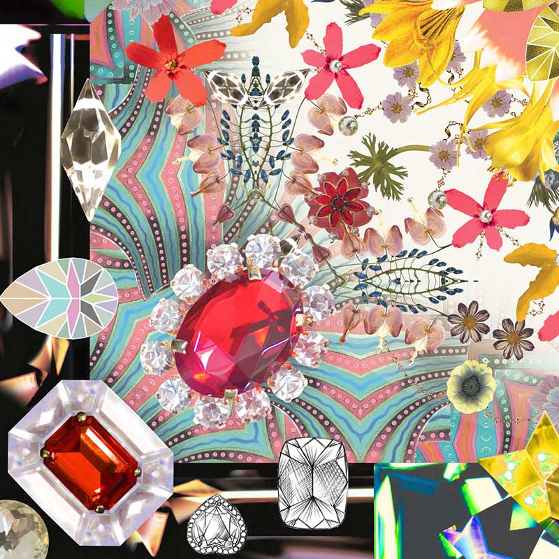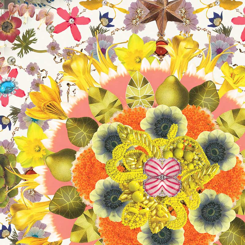 架空の庭を思い起こさせるラグで、キラキラと輝くマドラスのデザインを背景に、宝石と戯れるように色とりどりの花が咲き乱れています。