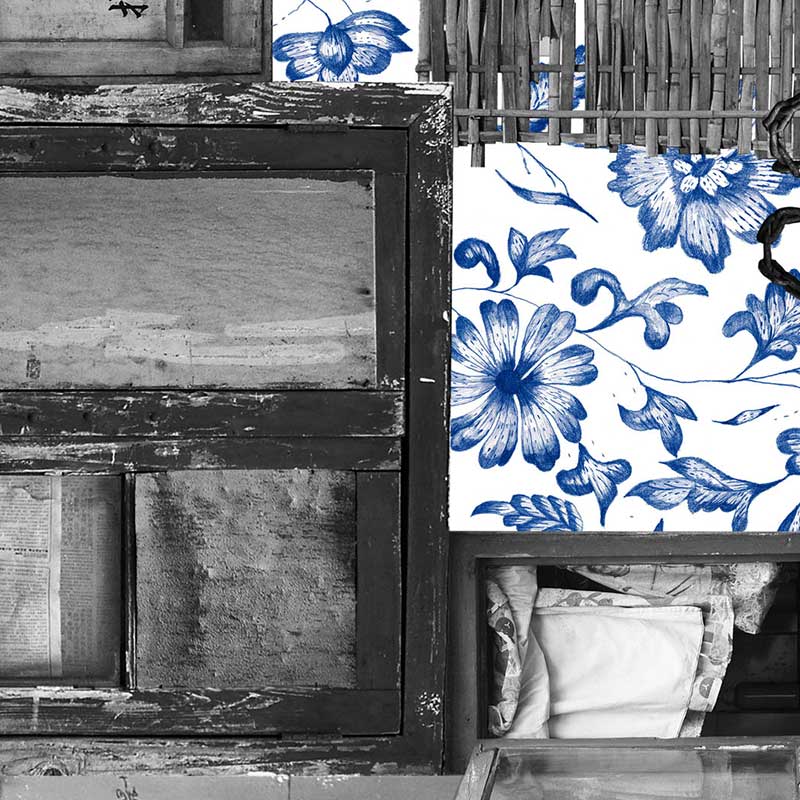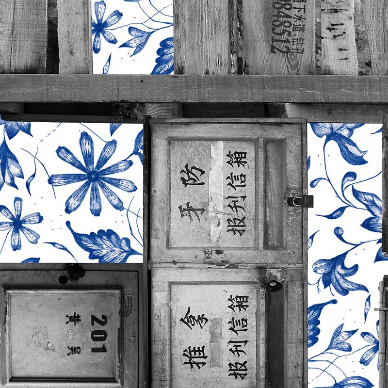 モノクロ写真のコラージュに藍色の壁紙パターンを重ねた作品です。写真にはデザイナーのネリアンドフーのナショナリズムでもある、中国のサインやテクスチャーが選ばれています。近代化が急激に進む中国で取り残された風景を、モノクロの写真にすることでそれを強調、伝統的な藍色の壁紙パターンがコントラストに使われています。