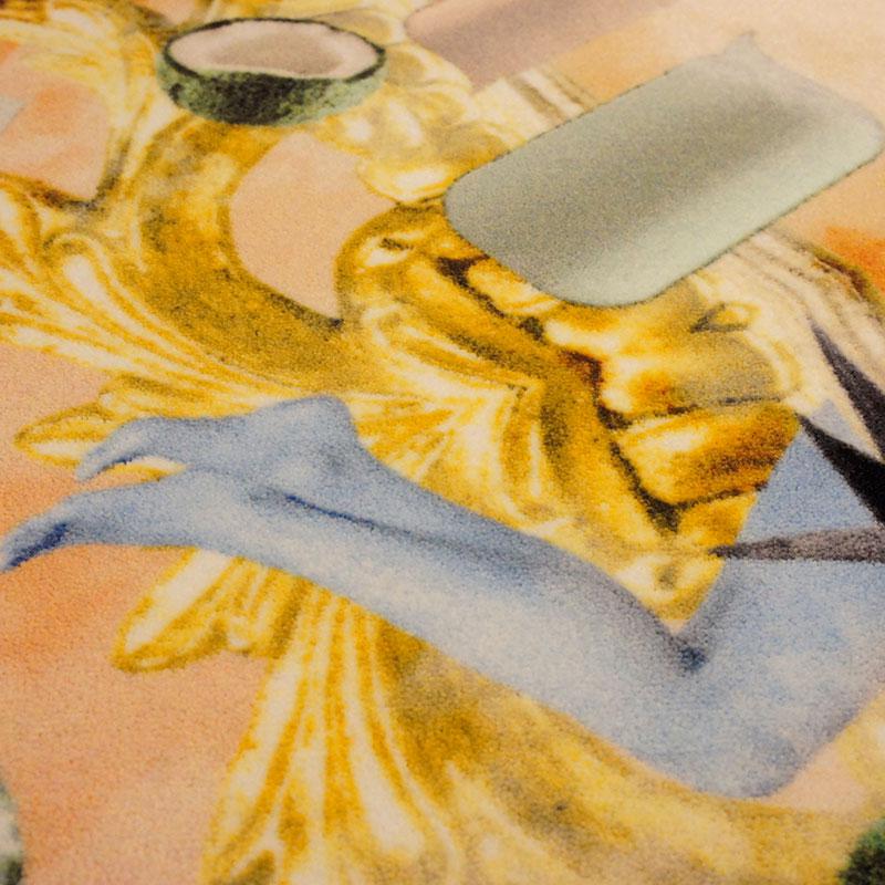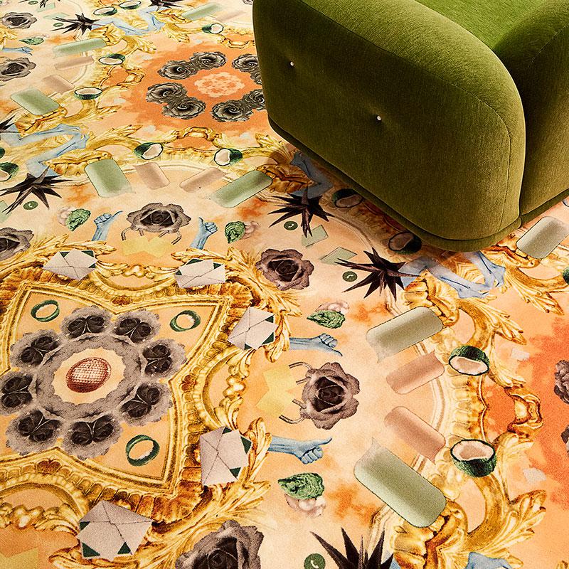 クラシックな装飾の中に現代的なモチーフが見え隠れする構図には、絶妙にグラデーションする中間色が多用され、moooiカーペットの高度な色再現性をもってしても難しいと言わしめた作品です。