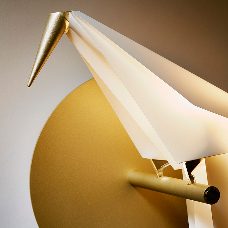 折り紙のように折られた鳥は、くちばしと尾羽根の先端の真鍮色の金属がおもりとなっており、止まり木の上でゆらゆらとバランスを取りながらスイングします。