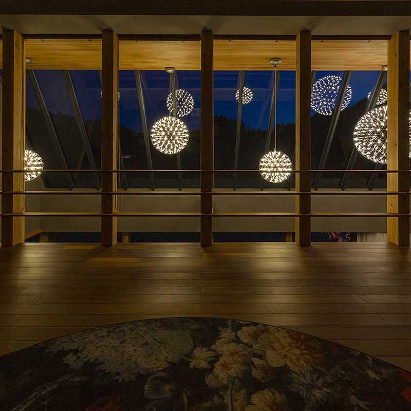 球体の内外に配置されたLEDは、あらゆる角度から光を放ちます。その姿は、まるで宇宙空間に瞬く星々。照明というより、光そのものがデザインされた芸術作品です。国際規格のDALI調光システムにも対応し、シーンに合わせた光の演出が可能です。
