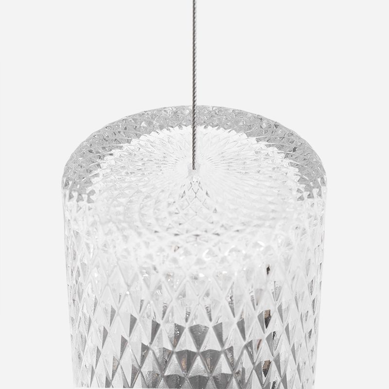 光を拡散するオーナメントにはボリュームのある切子ガラスが採用されています。メッシュのように繊細なカットが光を美しく拡散します。最大の特徴でもある、重力が描く自然な放物線を形作るアームコードには、柔軟でリッチな布編みのコードが用いられています。