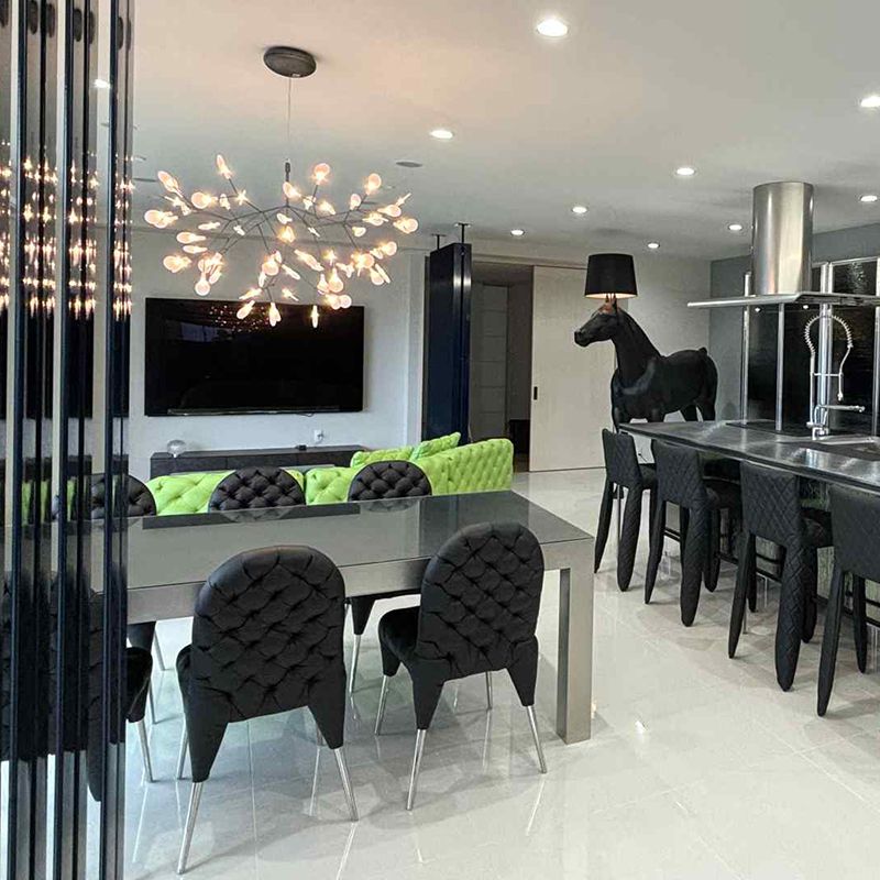 外形寸法は数値上大きく見えますが、「抜け」があるので空間のなかでも圧迫感を与えません。ダイニングテーブルの上に低めに吊るしても圧迫感が少なく、また照明自体がより良く見えます。