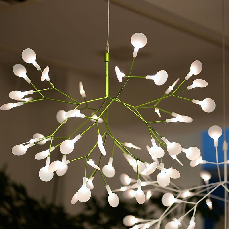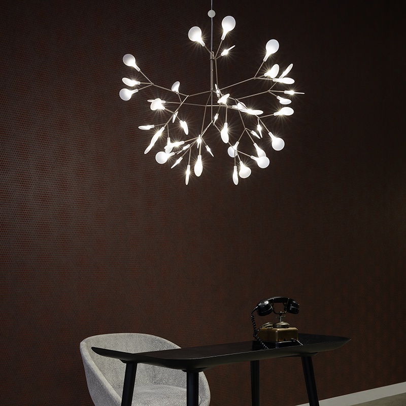 ヘラクレウム3の最大の魅力は、自然界にある植物の繊細さを照明として再現した点にあります。デザインモチーフとなったのは、セリ科の多年草「ヘラクレウム」の花。枝の先端に咲く小さな花弁を、LED光源と丸いディフューザーで表現しています。