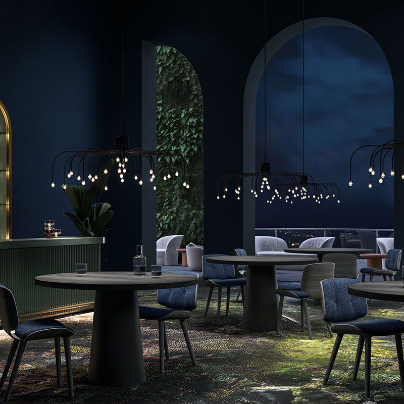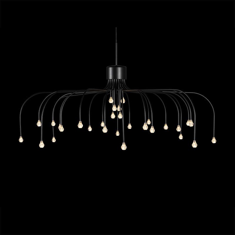 スターフォールライトは、現代風にアレンジされたアームが放射状に広がったサスペンションライトです。ちょうどシャンデリアが逆さまになったデザインで、30個のLED光源が下向きに星の光を注ぎます。