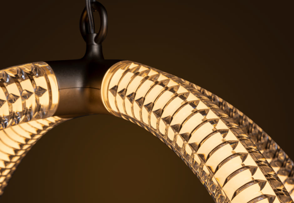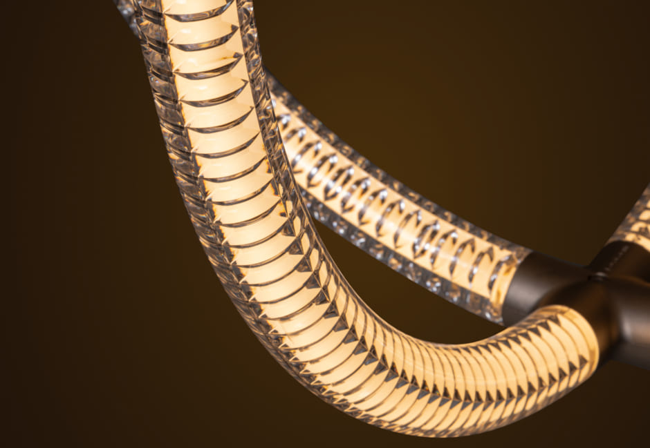 V字型のカットが施されたダイヤモンドパターンと、透明なチューブに封じ込められた光が織りなす輝きは、まるでガラス工芸品のような繊細さ。