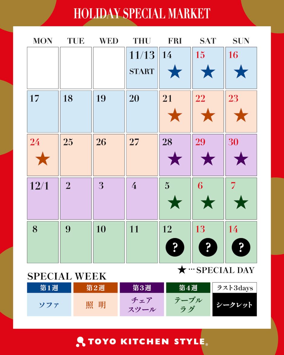 全国のショールーム*、オンラインショップにて「ホリデースペシャルマーケット」を開催します。