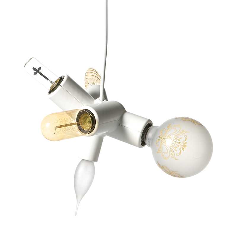 固定された形を持たず、使用者自身が光源を自由に選び、デザインを完成させるという革新的な照明。大きな電球、小さな電球、色付きガラス、すりガラス、丸い電球、炎の電球、管状の電球など、5つの光源を組み合わせて、空間にぴったりのスタイルをデザインできます。