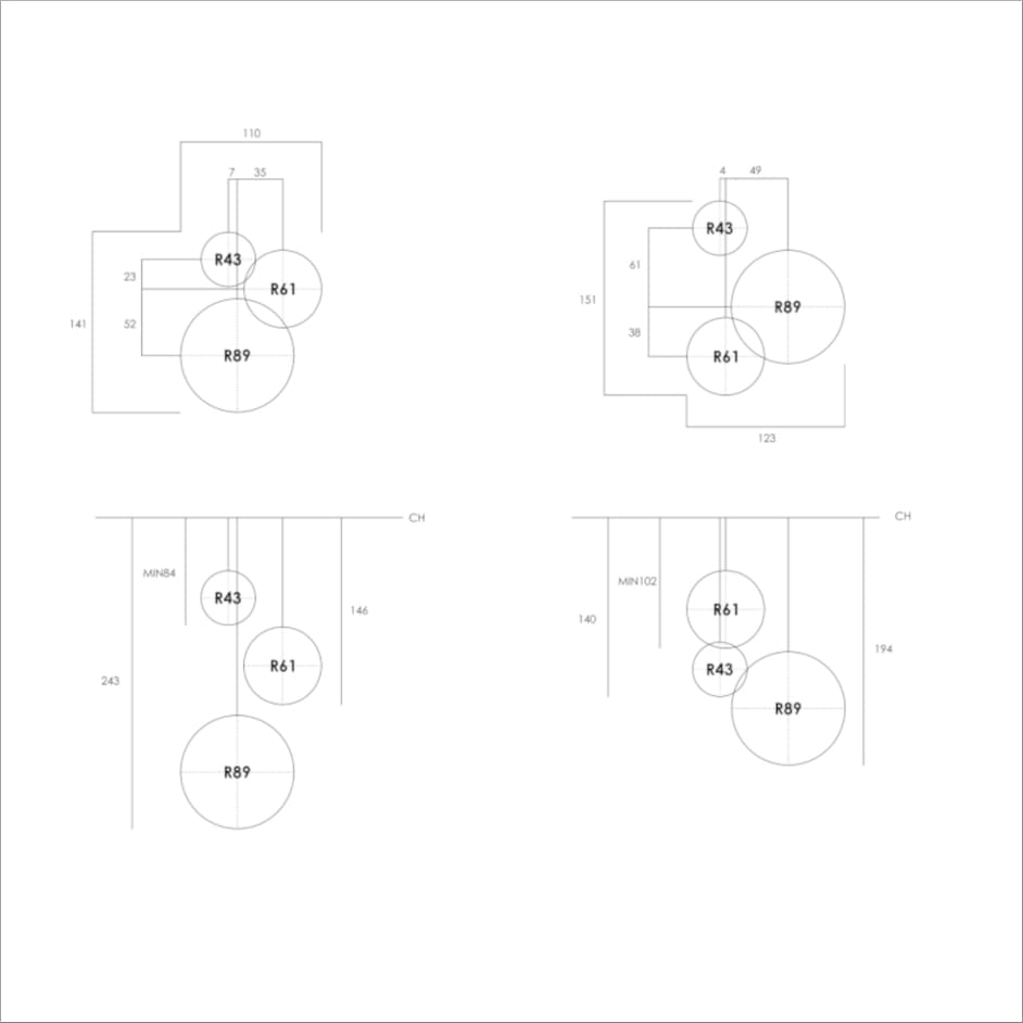 R89、R61、R43を高さ違いで配し、まるで惑星が浮遊するような立体的な光景を創出。