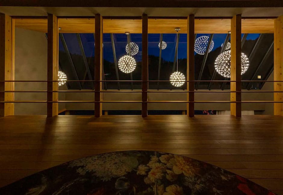 ダイニングテーブル上で小さな宇宙が瞬くように光を放つレイモンド。吹き抜け空間を縦横に漂う、大小の光の惑星たち。